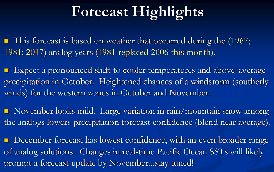 First up is the 90 day forecast from Oregon Department of Forestry Meteorologist Pete Parsons. Pete is a very good longer range forecaster. He is basing his forecasts on what has happened with years where we had similar climatic conditions. He has found that 1967, 1981, and 2017 had conditions much like we see now. It was the winter of 2016 - 2017 that produced that epic snowbomb event over Southern Oregon. Many times the solution to forecasting the future is to look at the past and similar conditions. Pete does this. Pete has a lot of information in his three month outlook. Click on the second image below to read Pete's report.