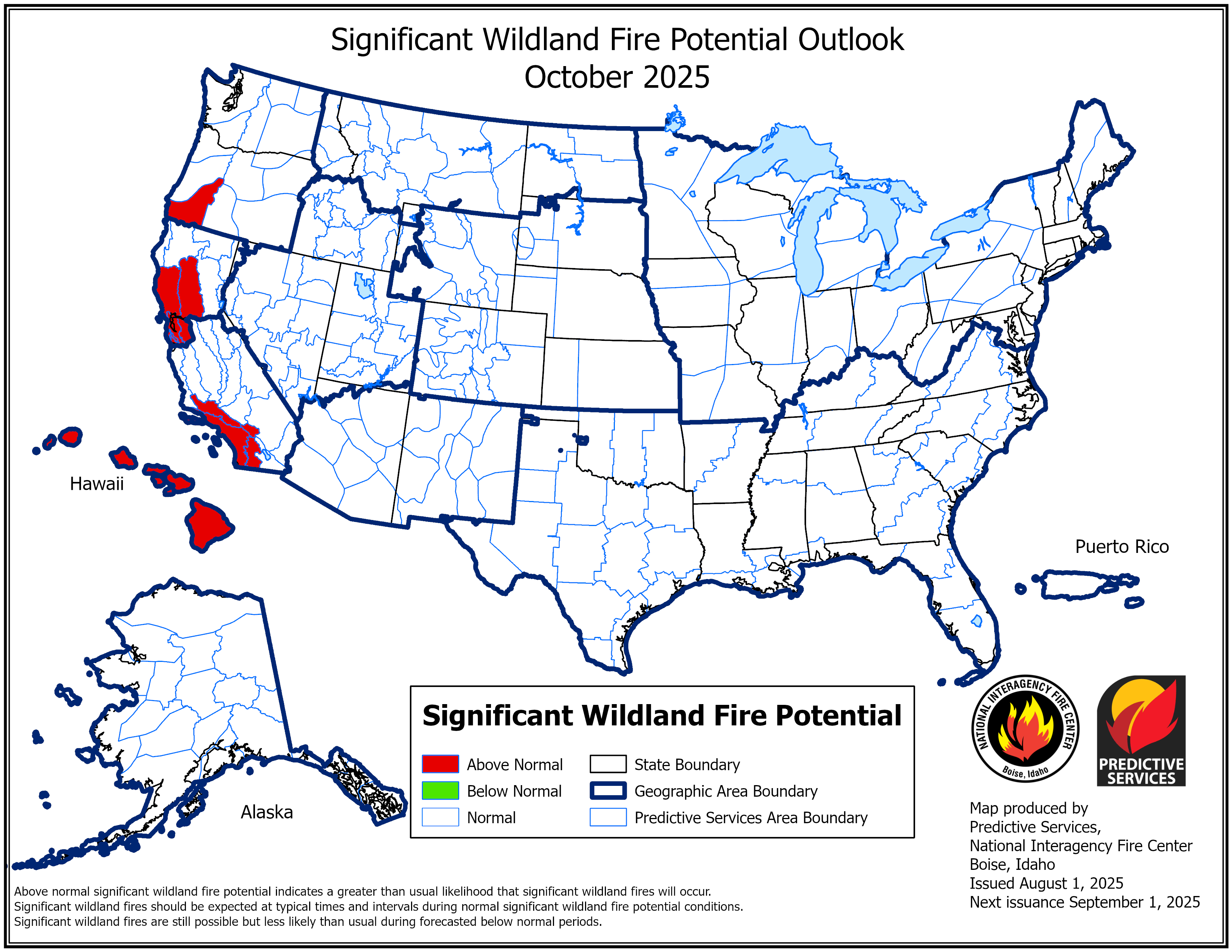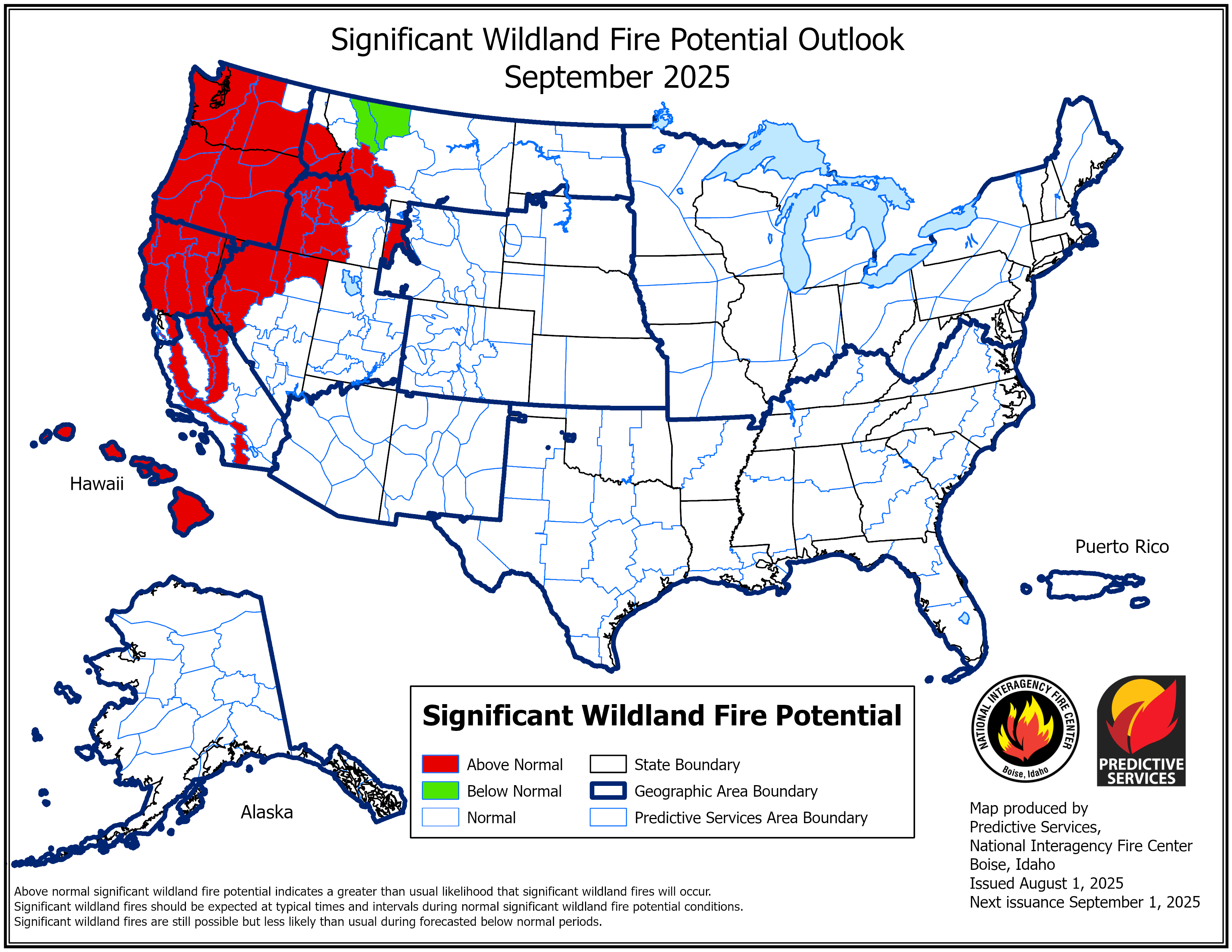 Here is the 7 day outlook on 8/30. The highest potential is going to be east of the Cascades. However, here in southwestern Oregon, we will see our risks bump up as heat and breezy to windy conditions arrive.